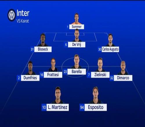 齐沃的态度很明确,那就是不轻视任何一个对手,这也是球队本赛季“虐菜”能够如此稳定的原因之一。从明天比赛的首发预测也能看得出来,天体和米体的预测完全一致,这说明即便不是最终阵容也应该大差不差。防线上,阿坎吉和巴斯托尼轮休,德弗里、比塞克和奥古斯托联袂首发;中场恰尔汗奥卢和苏契奇轮休,巴雷拉出任后腰,泽林斯基和弗拉泰西分列左右;两翼是迪马尔科和邓弗里斯这组最强搭档出战,锋线上则是劳塔罗与埃斯波西托的组合。