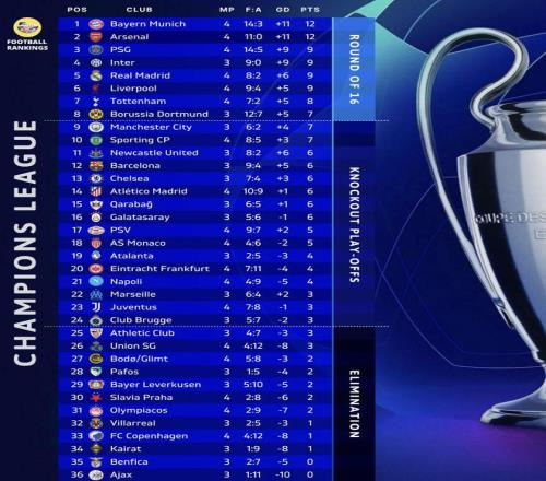 今天凌晨,欧冠联赛阶段第4轮开打。此前保持全胜的球队中,拜仁客场2:1击败卫冕冠军巴黎,皇马则是客场0:1不敌利物浦,阿森纳3:0轻取弱旅布拉格斯拉维亚。这样的话,就只剩拜仁和阿森纳4轮全胜排在积分榜前两位。