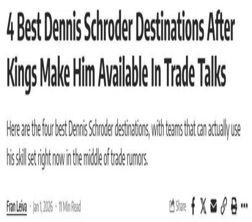 身背3年4500万美元合同,国王队正式甩卖施罗德!美媒《FW》晒出其4大下家候选,其中重回勇士队携手库里争冠高居第二名。