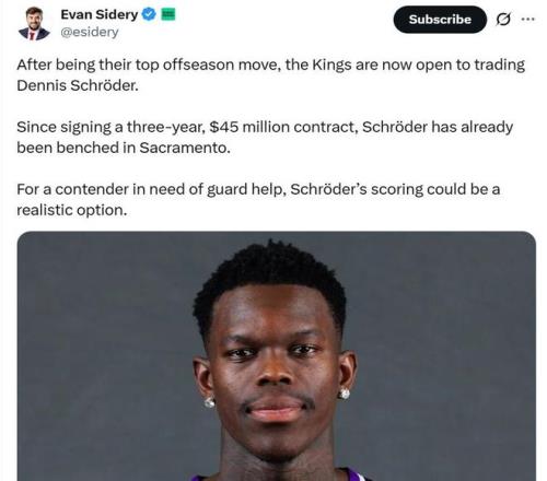 根据名记Evan Sidery报道,国王队已经正式将施罗德摆上货架,愿意听取其他球队对于他的交易报价。