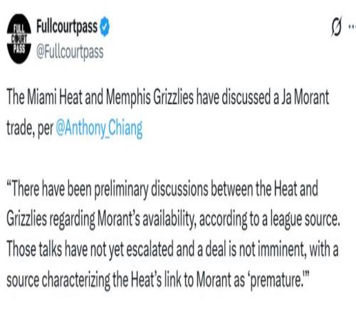 北京时间1月15日,据热火队记Anthony Chiang报道,热火与灰熊之间已就莫兰特的交易可能性进行了初步谈判。不过这些谈判尚未升级,交易也并非迫在眉睫,有消息人士称热火与莫兰特的关联还“为时过早”。