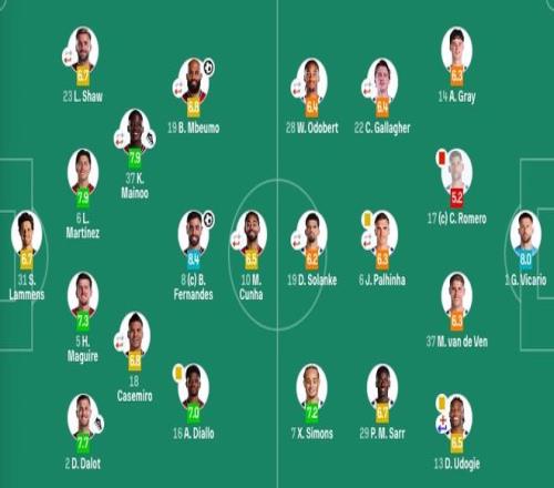 曼联首发:31-拉门斯、2-达洛特、5-马奎尔、6-利桑德罗、23-卢克·肖(87’3-马兹拉维)、18-卡塞米罗(87’15-约罗)、37-梅努(92’39-泰勒·弗莱彻)、16-阿玛德、8-B费、10-库尼亚(75’30-谢什科)、19-姆伯莫(87’11-齐尔克泽)