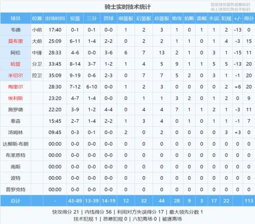 骑士生涯前6场比赛,哈登场均18.7分5板8.7助,投篮命中率50.7%,三分命中率47.1%。米切尔外线失准,今天投篮19中9,三分6中0,罚球3中2,得到20分7板5助2断3失误。阿伦6中4拿到11分13板2助,正负值-15全队最低。