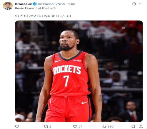 第二节杜兰特6分钟里5中3+三分3中2拿到8分1抢断,上半场杜兰特12中7,三分4中3,拿到18分2助攻2抢断2盖帽0犯规,正负值+8,有了谢泼德在先发搭档KD,老鹰不敢肆无忌惮的高位包夹,加上申京在场的持球威胁。